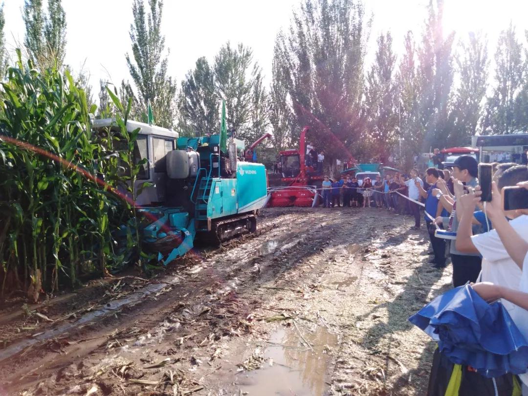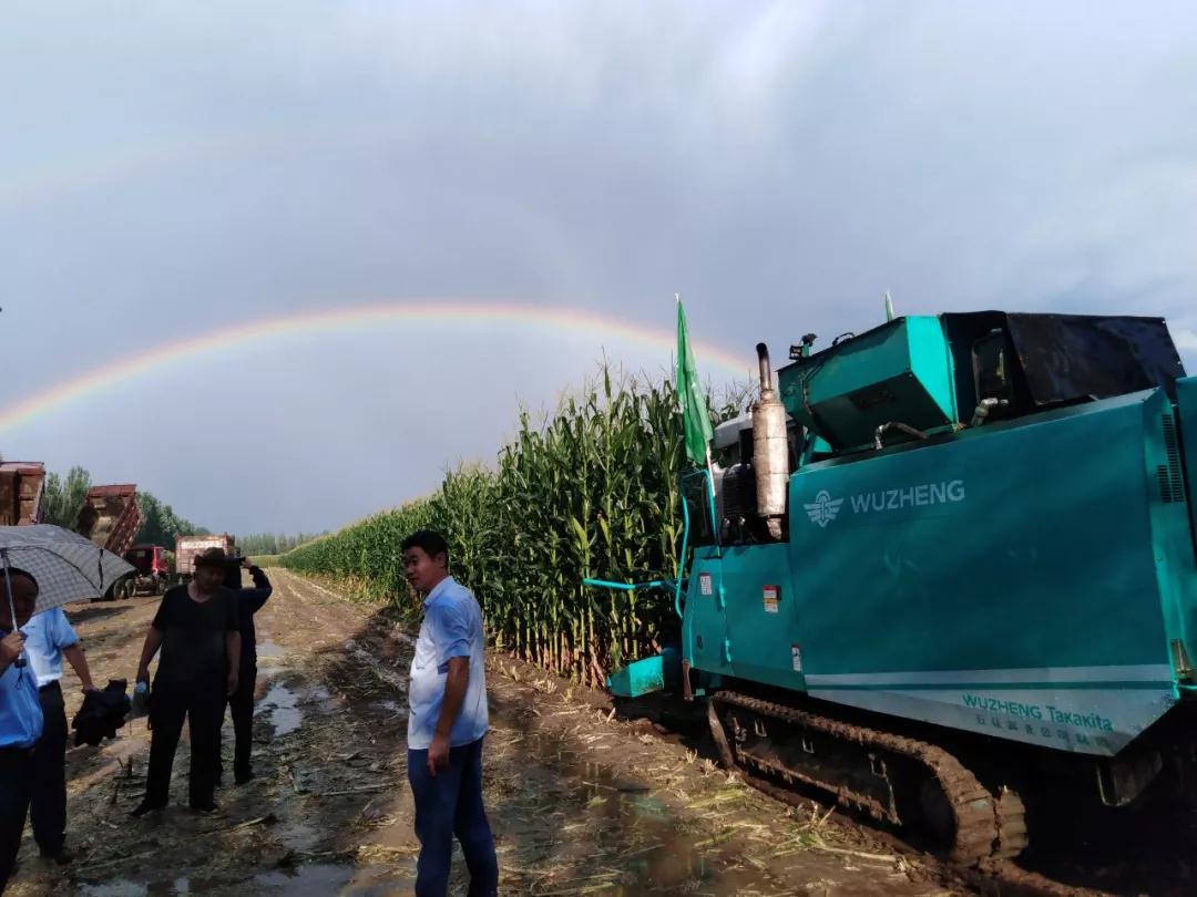 雨后放晴的玉米地里,P1000青飼料收獲打捆機(jī)伴隨著美麗的彩虹出場亮相,引得周圍的觀眾紛紛拍照錄像。