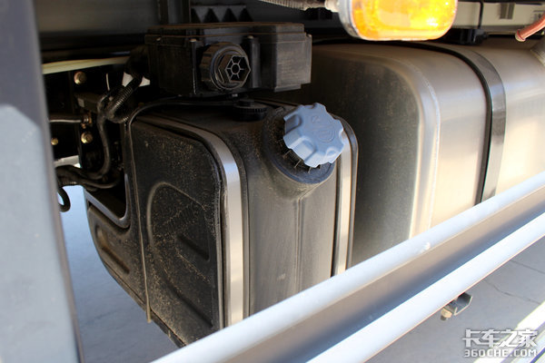 尿素罐和油箱布置在車架的左側,兩者連接非常緊湊,油箱為鋁合金材質,對整車降重有一定的幫助。
